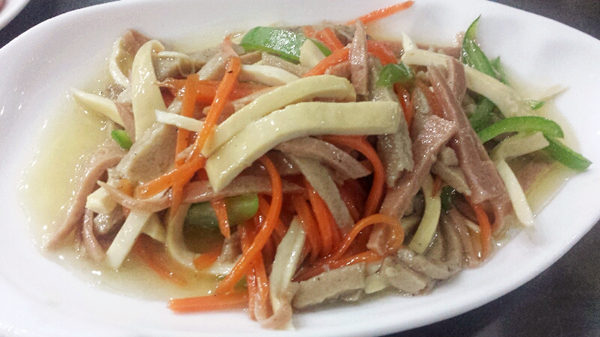 (2)素鸡片入热油锅煎至两面金黄色即可。