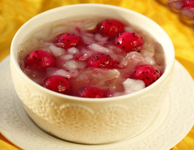 6、用挖球器将红龙果挖出小球,放入已温凉的雪蛤银耳汤中,加入适量的蜂蜜搅拌均匀即可食用。