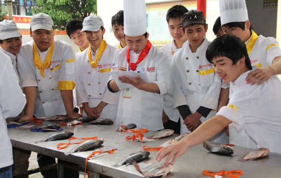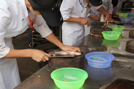 广西华南烹饪学校连日来的基本功比赛在丰富学生们的课余生活的同时加强了学生们的基本功训练。活鱼宰杀是今天同学们比赛的项目之一,面对活蹦乱跳的鱼,宰杀真的是无从下手,但是对于广西华南烹饪学校的学子显然不是问题,选手们除要在选鱼、打鳞、去鳃、除内脏外还要在规定的时间内对鱼进行削片、切丝,每个比赛选手熟练的操作着,连场边围观的裁判老师都赞不绝口。
