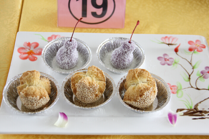 此次考核学生们作了两种具有代表性的面点“开口枣”和“紫薯雪梨”。用油炸过的“开口枣”香飘四溢。油的香味融入在“开口枣”中,蓬松的面团和油、芝麻一起造就了味蕾上独特的味觉享受。