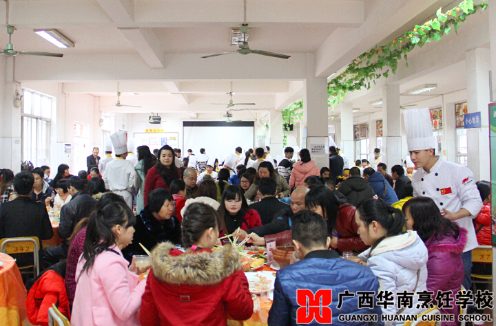 参观结束之后,在学生的陪同下家长们来到了“百家宴“的主会场共同分享由同学们亲自烹制美食,宴会上老师学生家长举杯同庆,享受美好时刻,家长们的脸上都浮现出了欣慰和自豪的笑容。新的一年,广西华南烹饪学校祝福大家阖家欢乐,幸福美满。
