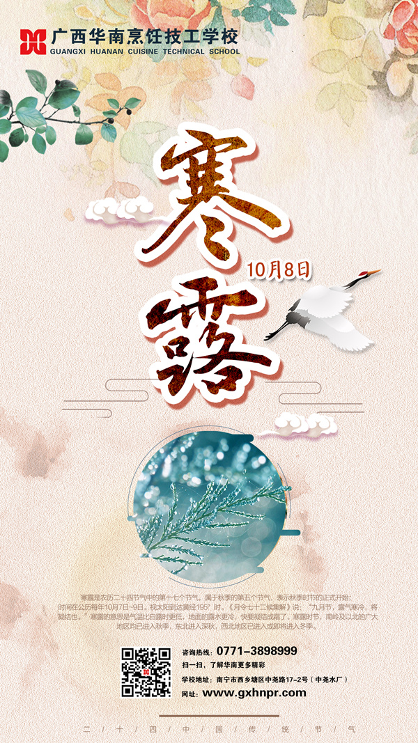 今天是二十四节气中的“寒露”,寒露是二十四节气中的第十七个节气,属于秋季的第五个节气。《月令七十二候集解》说:“九月节,露气寒冷,将凝结也。”寒露的意思是气温比白露时更低,地面的露水更冷,快要凝结成霜了。白露、寒露、霜降三个节气,都表示水汽凝结现象,而寒露是气候从凉爽到寒冷的过渡。